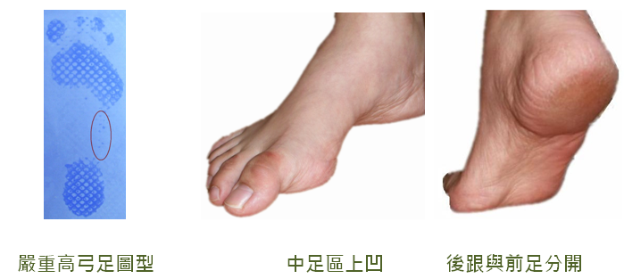 足部特徵:內側與外側蹤弓都很高,易發生爪形足圖形特徵:腳跟與腳掌之間的中足區不相連;最大壓力易出現在小趾跟部與後跟外緣