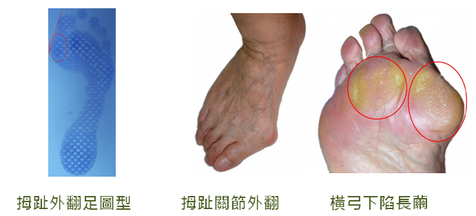 足部特徵:大拇趾關節外凸,易合併扁平足。