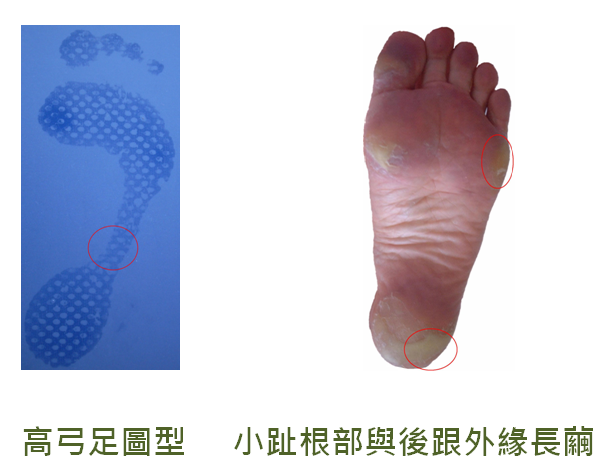 足部特徵:內側與外側蹤弓都很高,易發生爪形足。