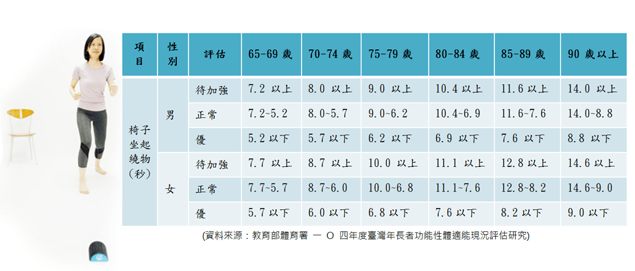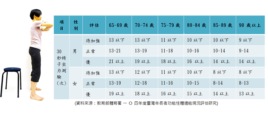 平衡能力也包含了下肢的肌力與柔軟度,藉由30 秒椅子坐立檢測來看看下肢肌力如何吧!